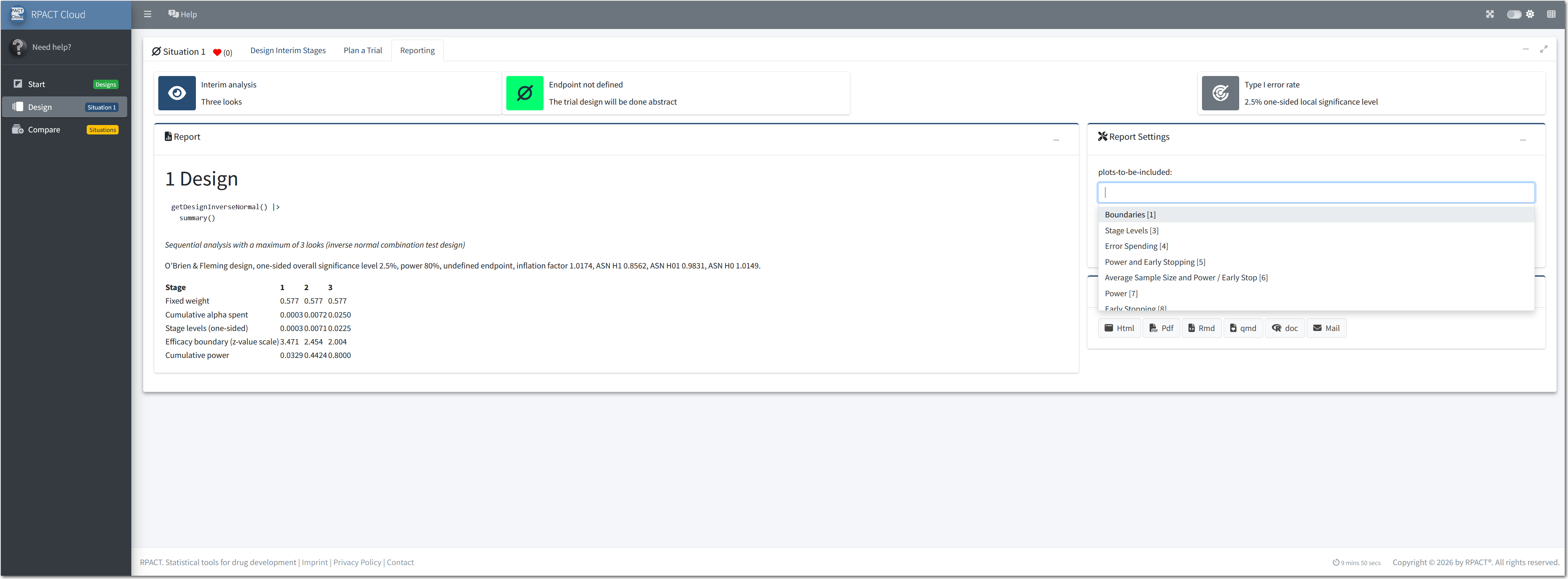 O’Brien & Fleming design, non-binding futility, one-sided overall significance level 2.5%, power 80%, undefined endpoint, inflation factor 1.0628, ASN H1 0.8528, ASN H01 0.8821, ASN H0 0.7059.