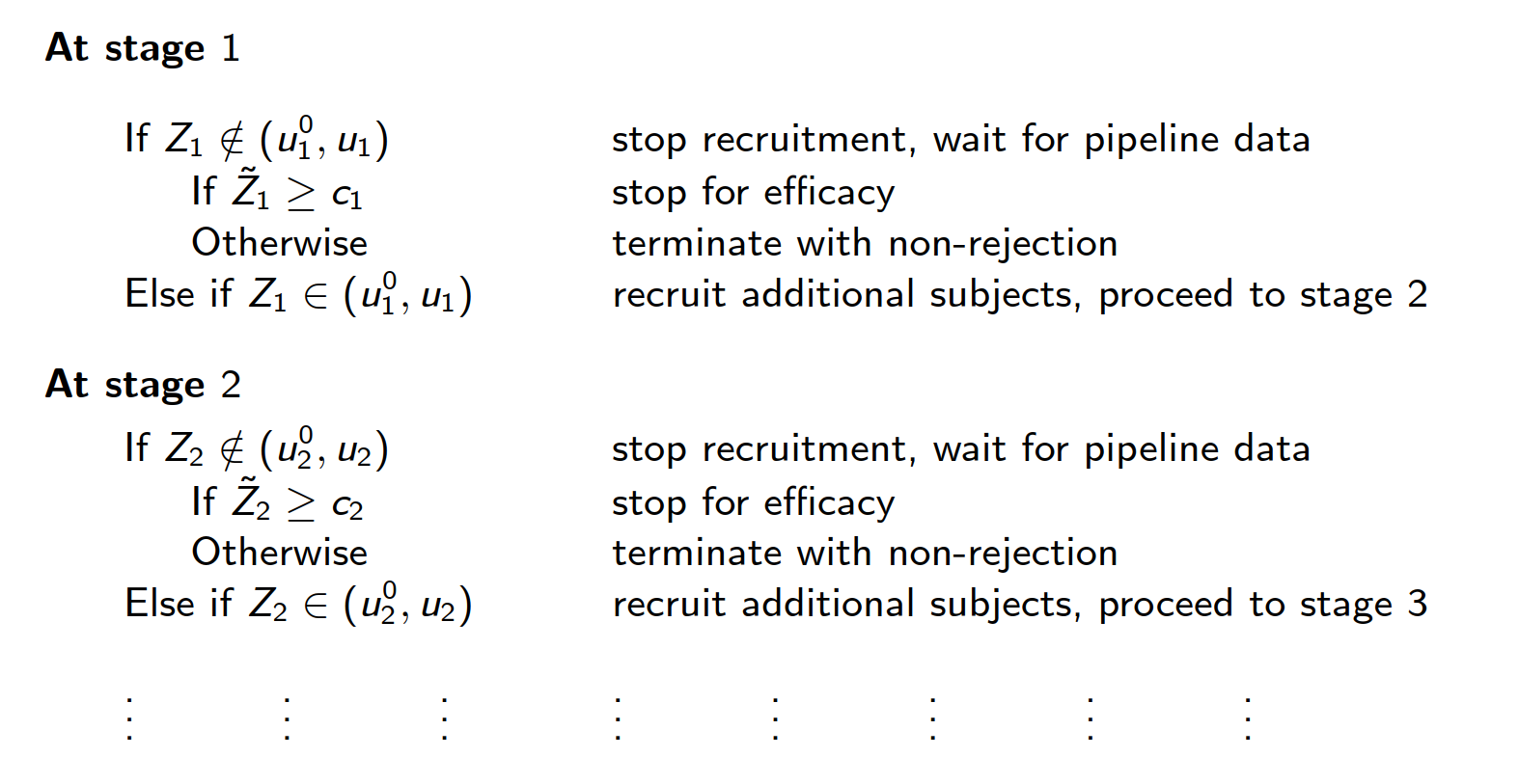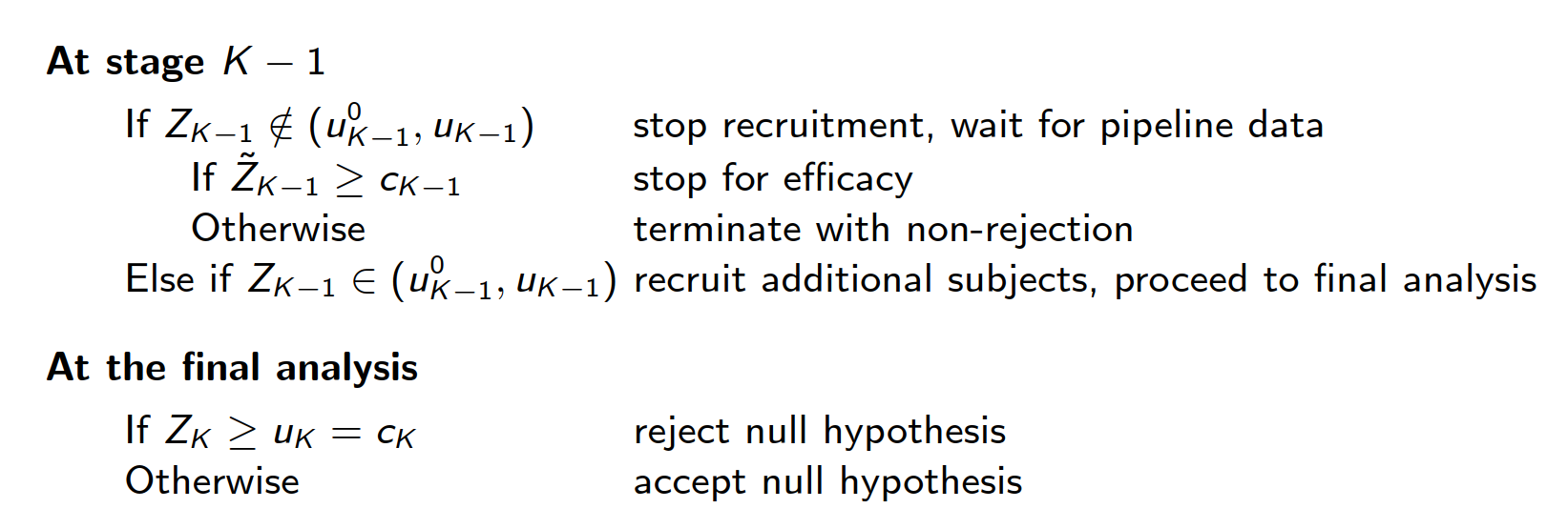 According to Hampson and Jennison (2013), the boundaries \(\{c_1, \dots, c_K\}\) with \(c_K = u_K\) are chosen such that “reversal probabilities” are balanced, to ensure type I error control.